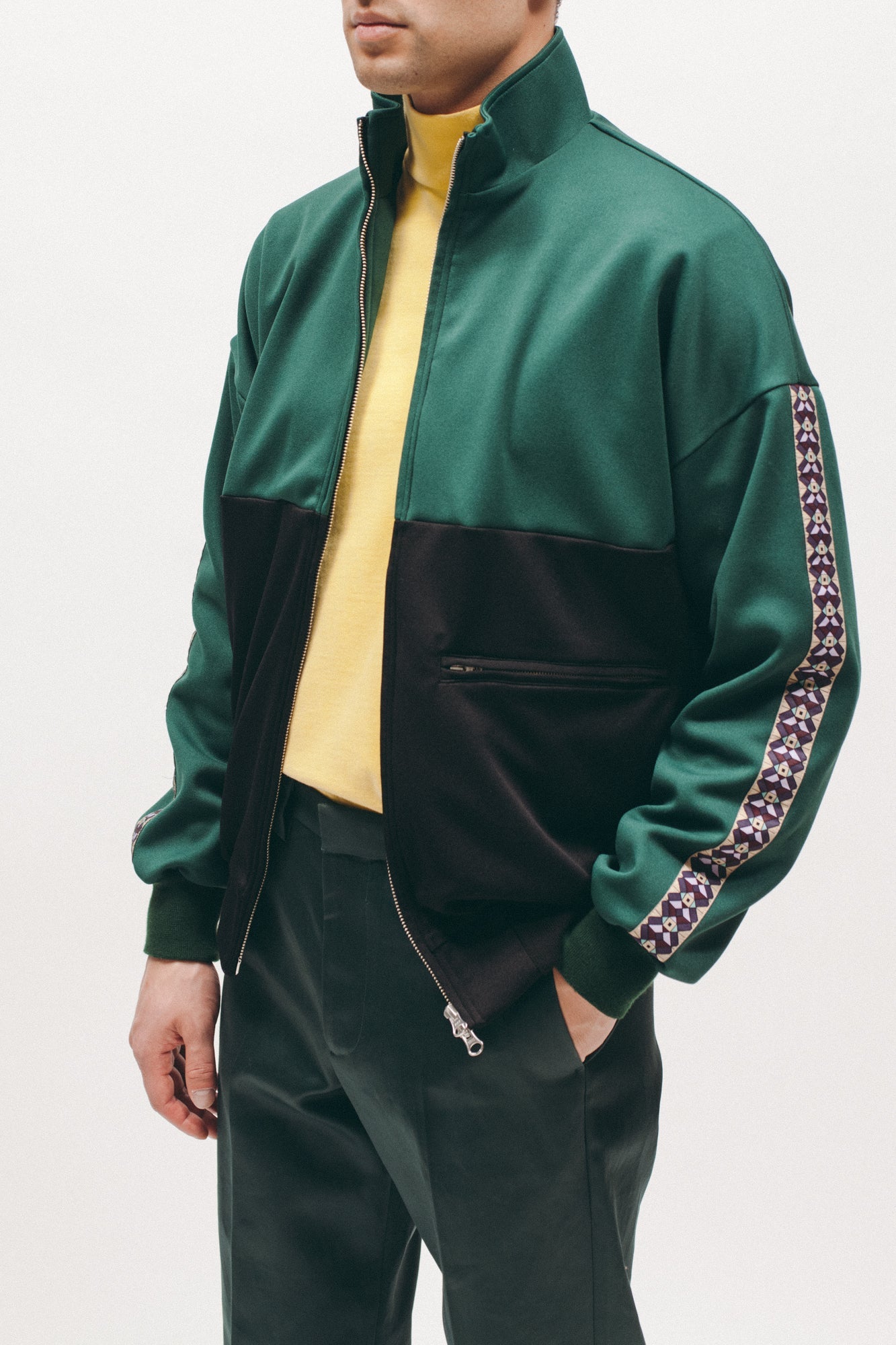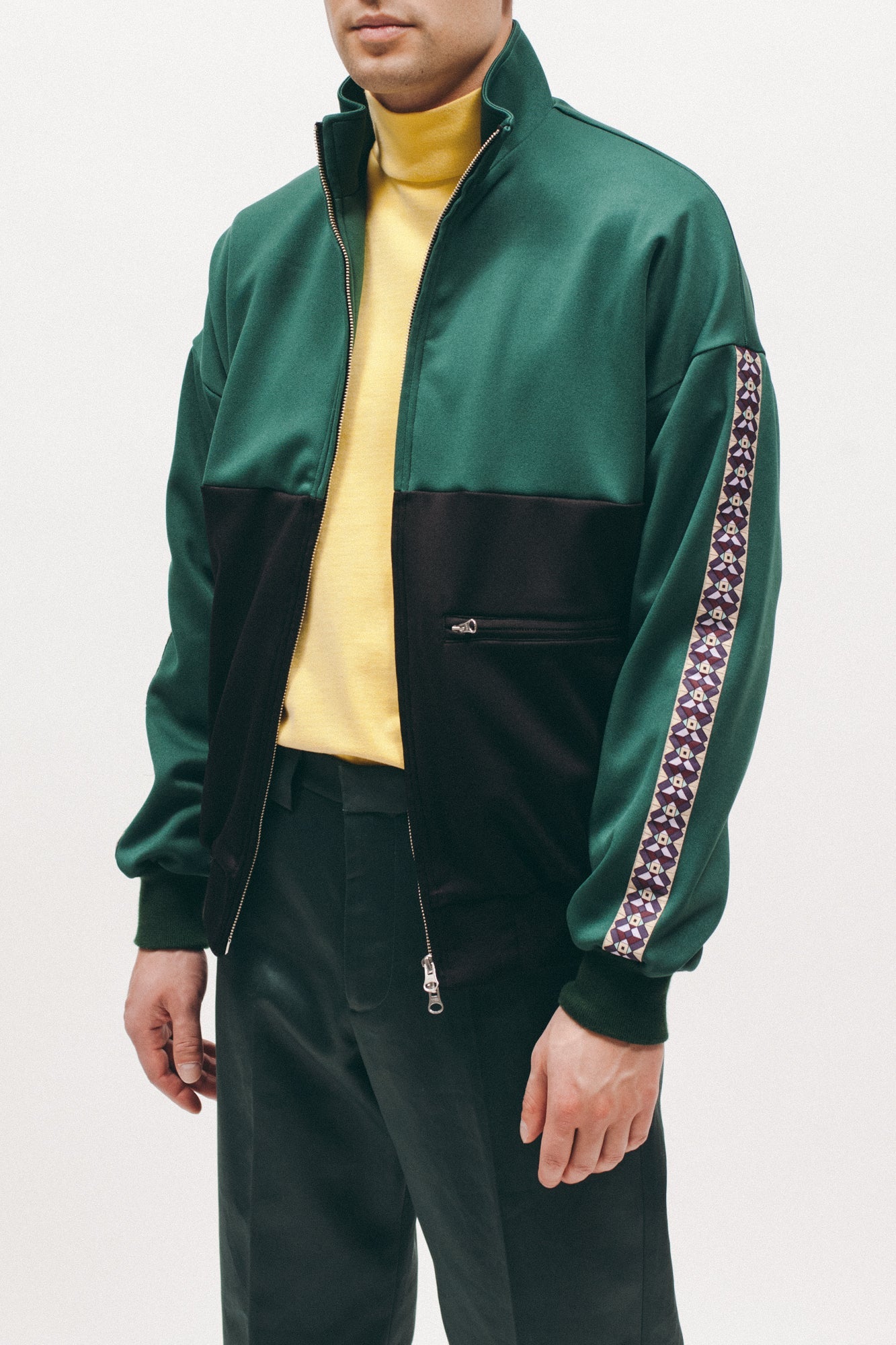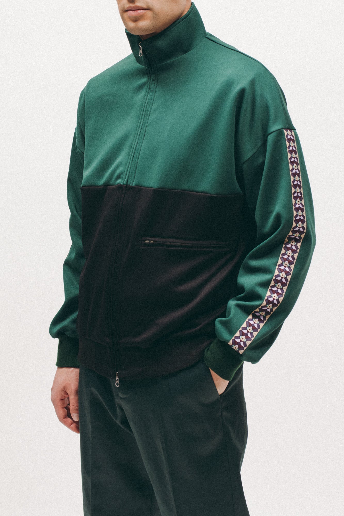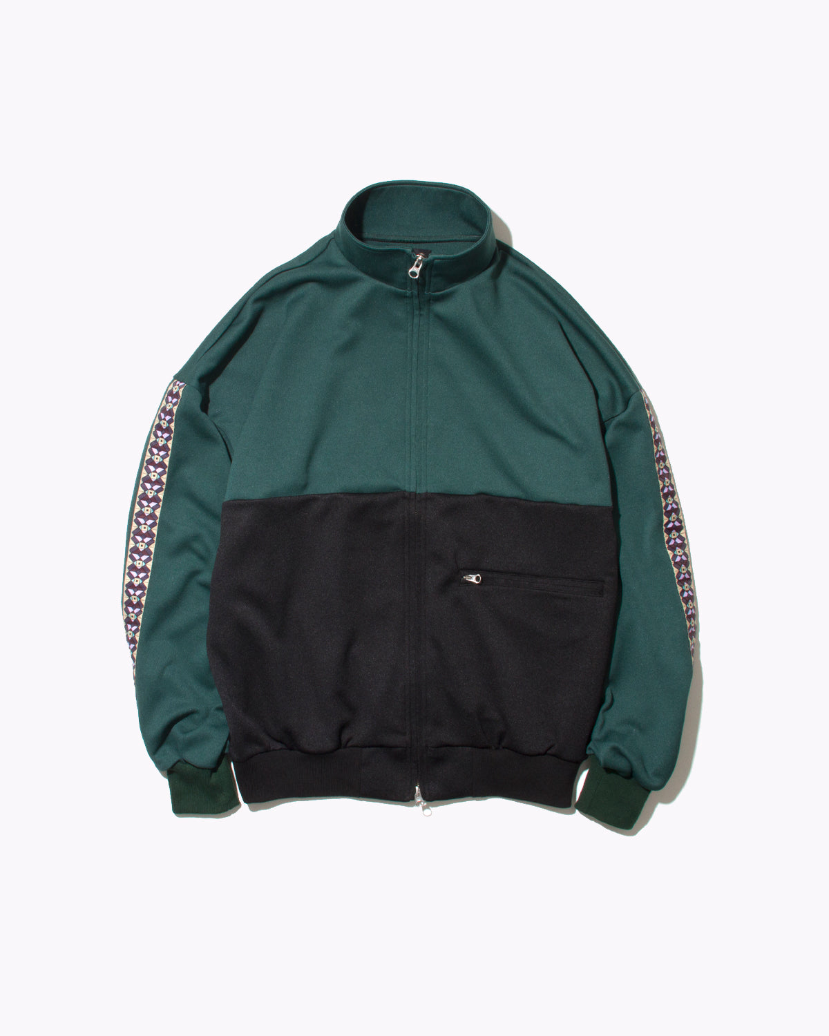 The Track Jacket features contrast paneling, single zip pocket on left side, and a patterned stripe on the sleeves.