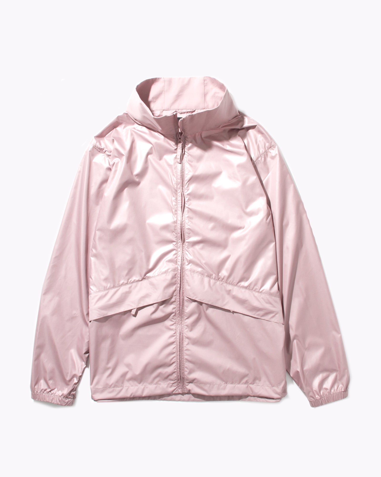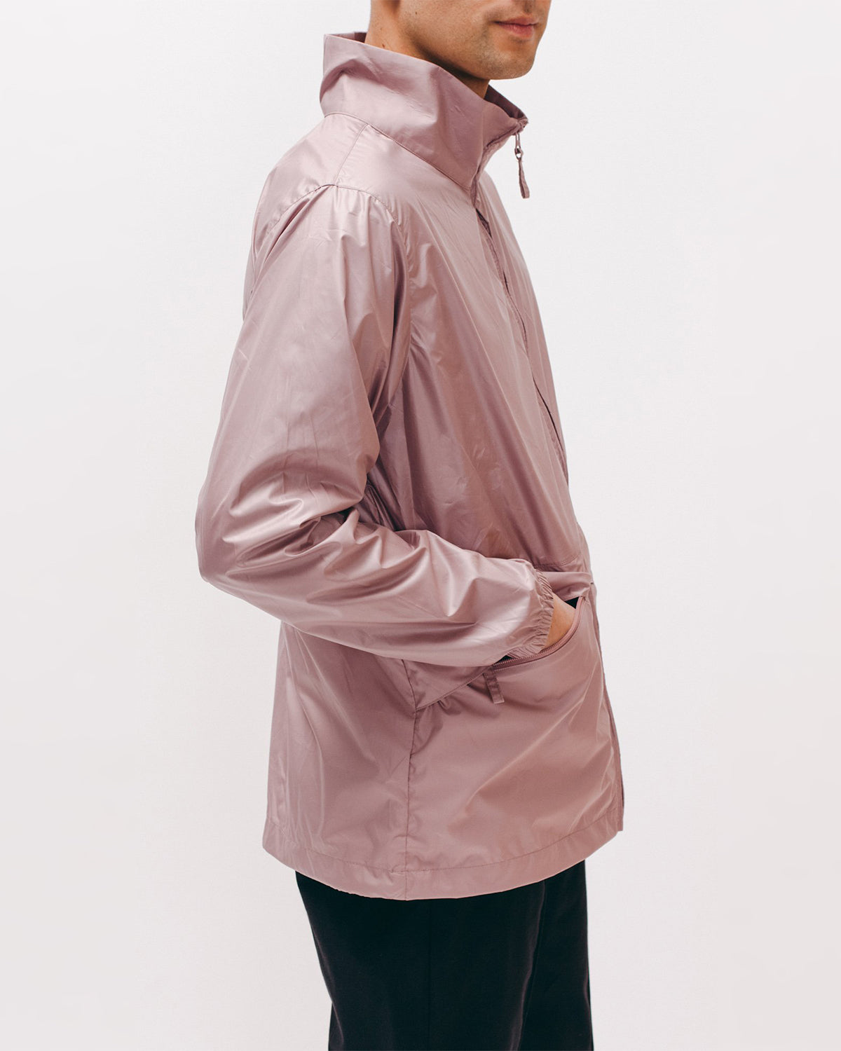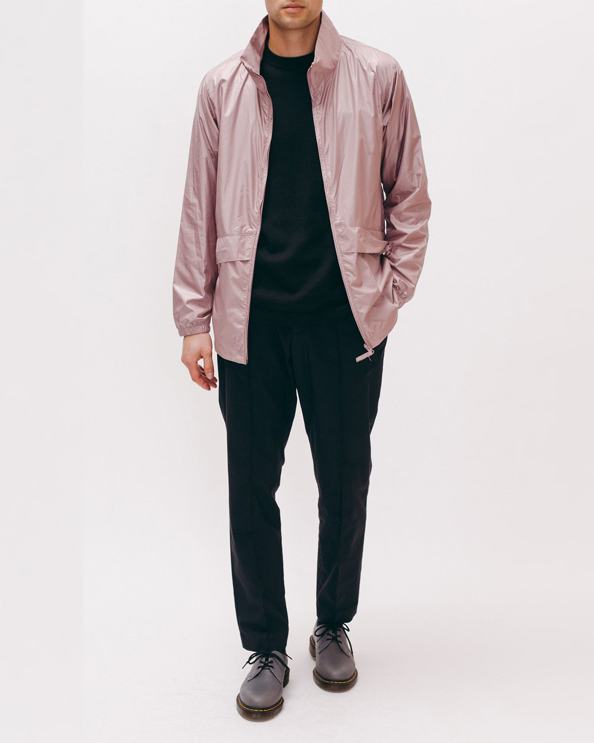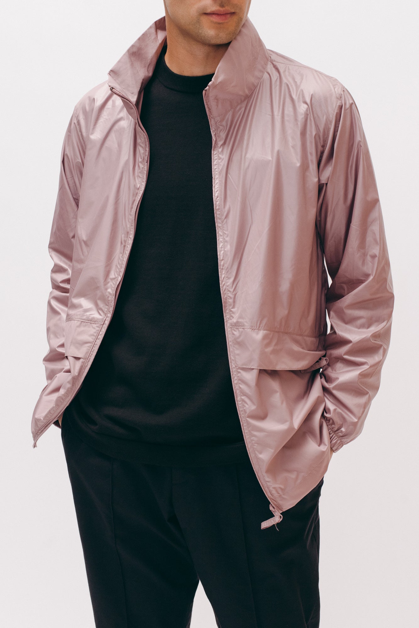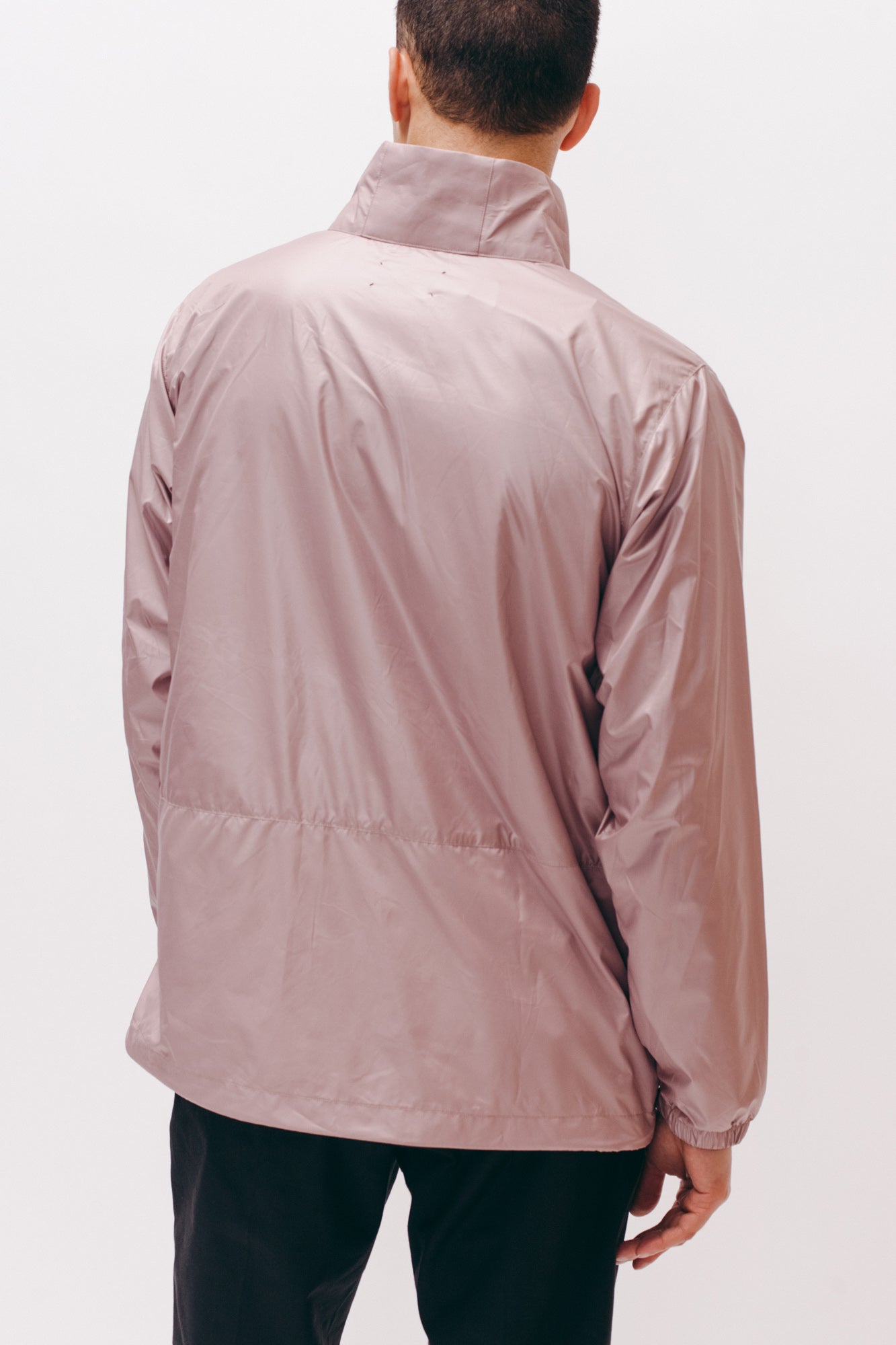 The Nylon Warm Up Jacket is constructed from a shiny nylon and features a mock neck, metal front zipper closure, front pockets, and elastic at cuff and drawstring waist.